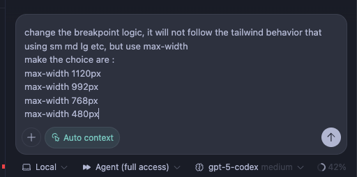 Kenapa pilih tailwind? karena mudah untuk di-maintain dan customize - Karena barrier-to-develop sudah jauh berkurang dikarenakan adanya AI saat ini, maka tanpa pikir jauh langsung coba vibe code mode! Dan kebetulan juga, GPT /Codex ini “bahan” latihan train dia pakai React.
